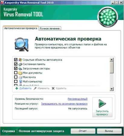 Kaspersky Virus Removal Tool 9.0.0.722 6.04.11 - бесплатный антивирусный сканер.Kaspersky AVP Tool позволяет просканировать любой указанный файл и, если будет обнаружен вирус, удалить его или переместить в "карантин".
